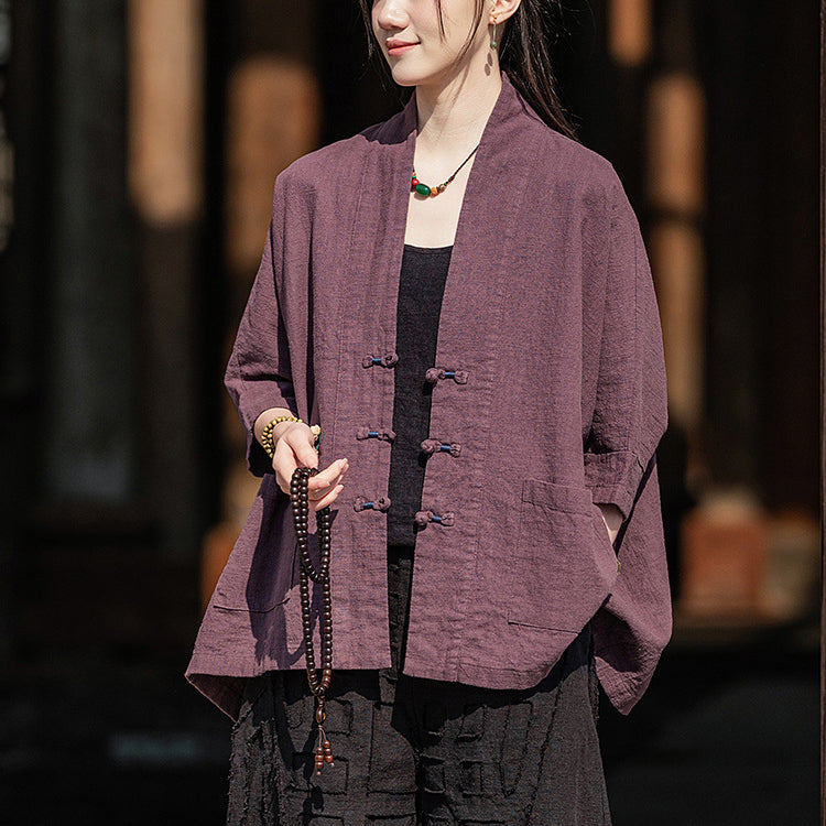 Vintage Chinese V-neck frog button long-sleeved cotton shirt, casual loose cotton  linen kimono 20250328