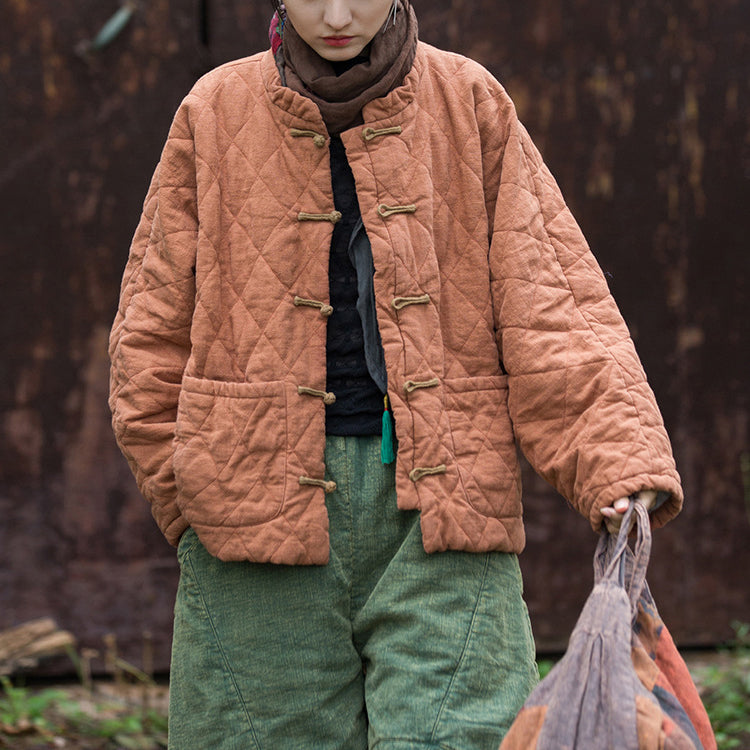 2024 winter women's new quilted diamond lattice cotton jacket cotton jacket, plate buckle literary personality retro women's cotton coat 20241113