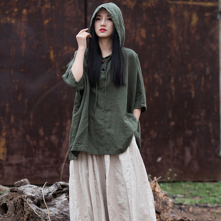 Casual cotton linen hooded shirt, cotton linen loose casual shirtplus size