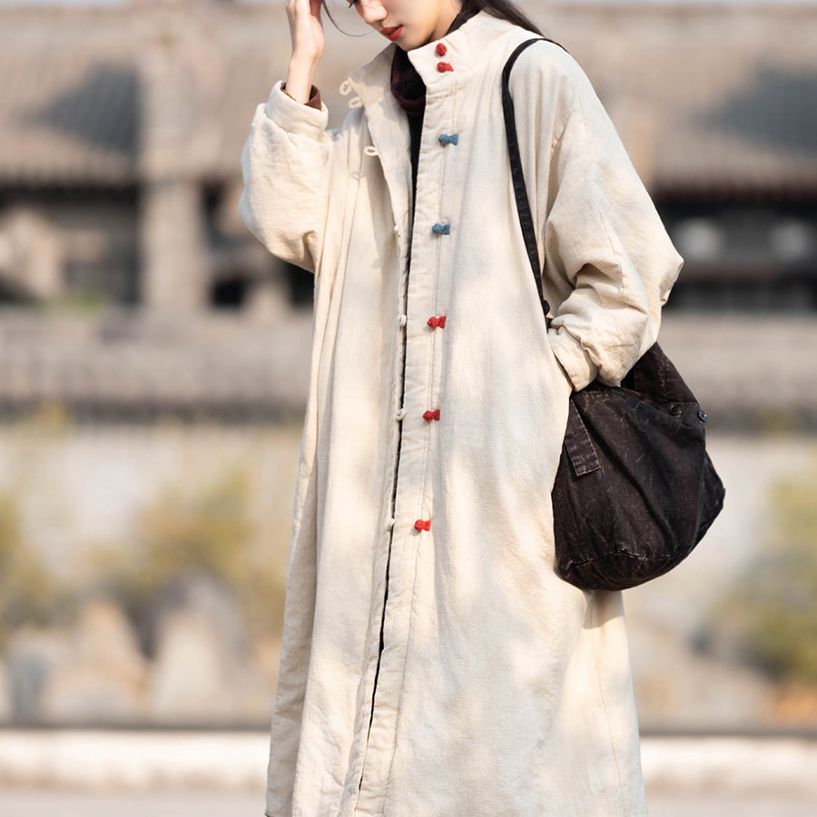 Loose Oversize Winter Linen Coat, Vintage Chinese Standing Collar Frog Button Coat Plus size