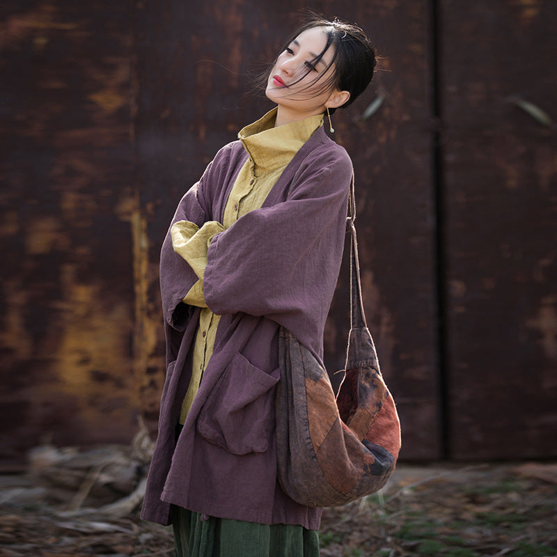 Loose Women's Cotton Linen Stonewashed Jacket, Vintage Casual oversize Kimono Jacket