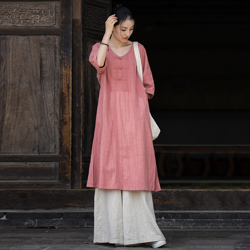 Frog Button V-Neck Handmade Tie-Dye Dress Loose Cotton Linen Dress 20240714