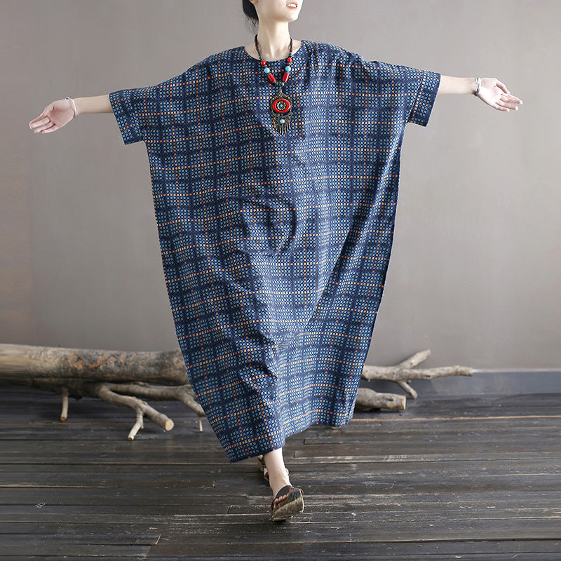 Oversize Plaid Printed Dress,Loose Casual Boat neck Cotton Dress Plus size