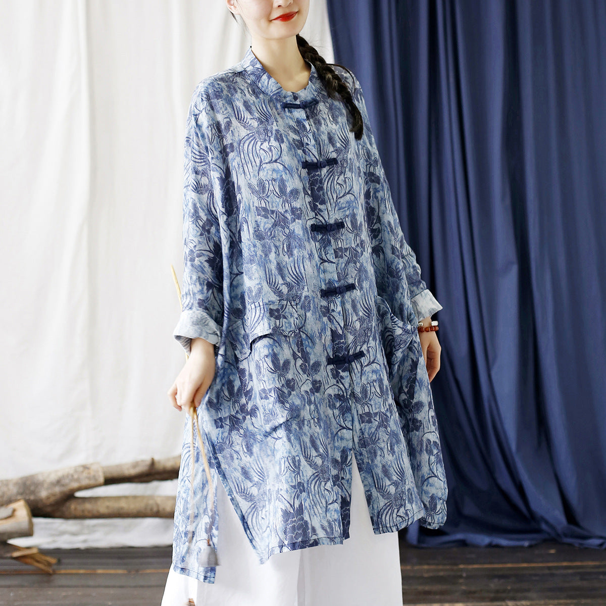 Summer Blue Botanical Printed Linen Shirt, Vintage Chinese Standing Collar Frog Button Casual Long Shirt Plus size