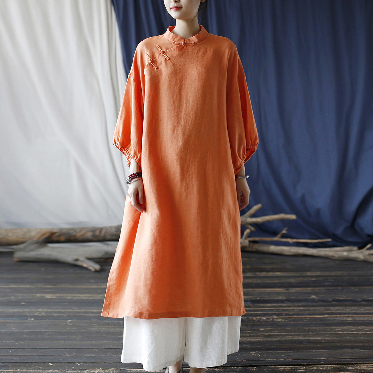 Summer Printed Standing Collar Chinese Frog Button Casual Shirt, Loose Ramie Shirt 20240803