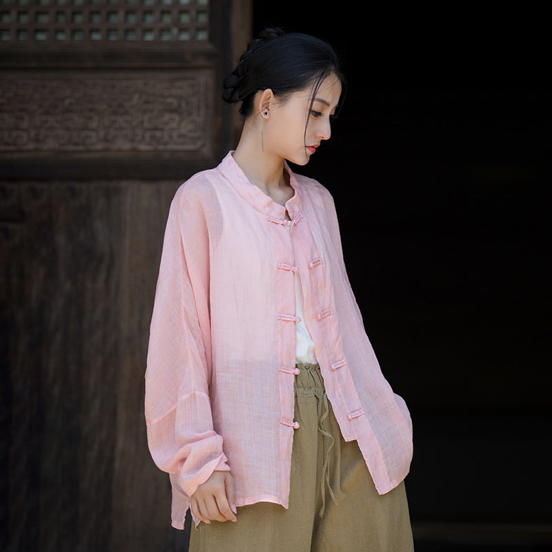 Summer Ramie Chinese Standing Collar Shirt,Sand Washed Frog Button Women's Long Sleeve Shirt 20240714