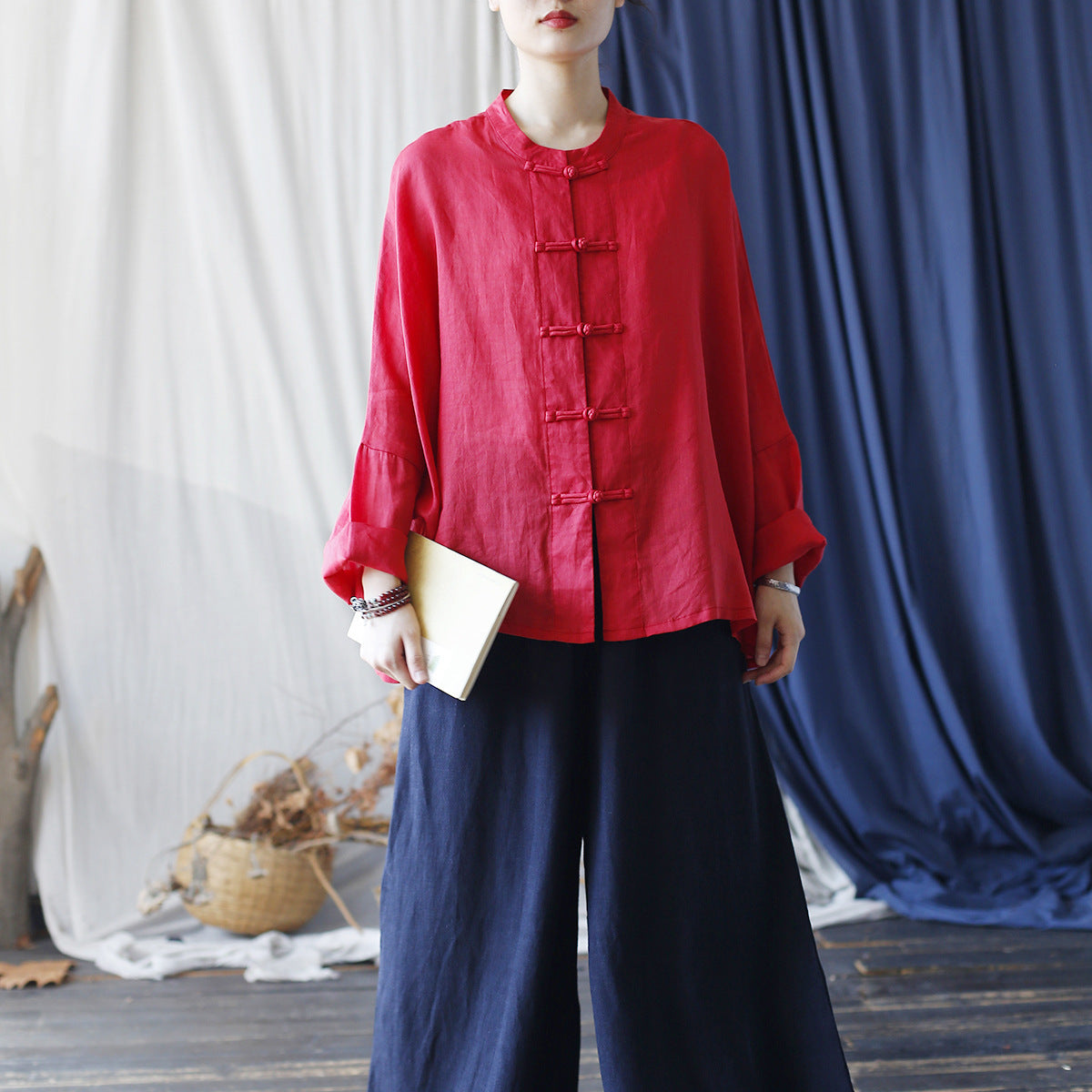 Summer Standing Collar Women Ramie Frog Button Shirt, Literary Retro Long Sleeve Loose Light Cardigan 20240802