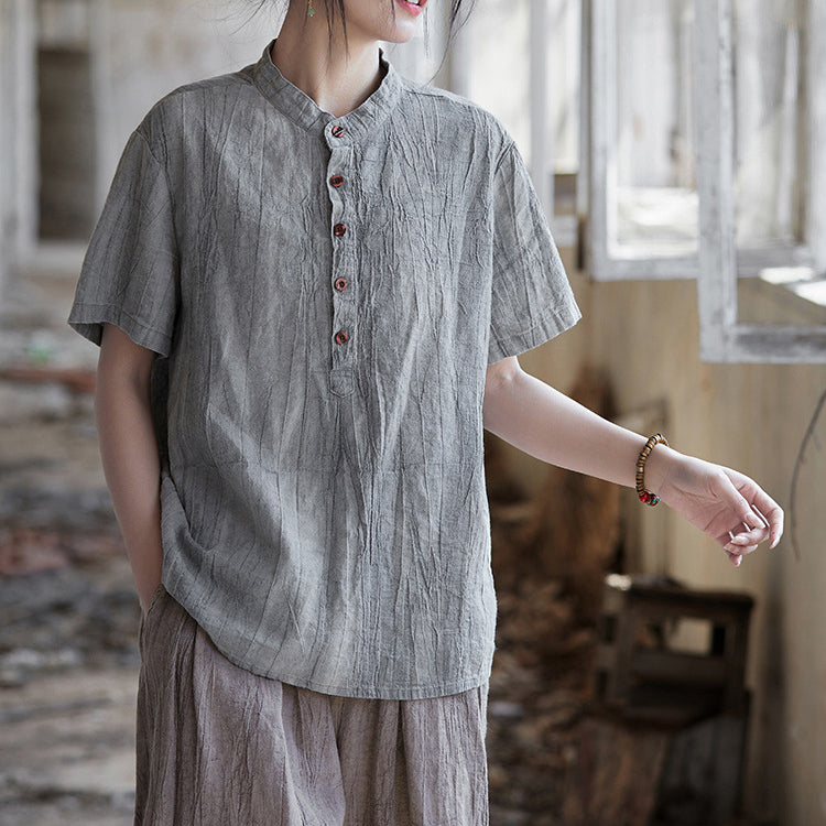 Summer tie-dye stone washed cotton linen short sleeve shirt, vintage boat neck cotton short sleeve shirt