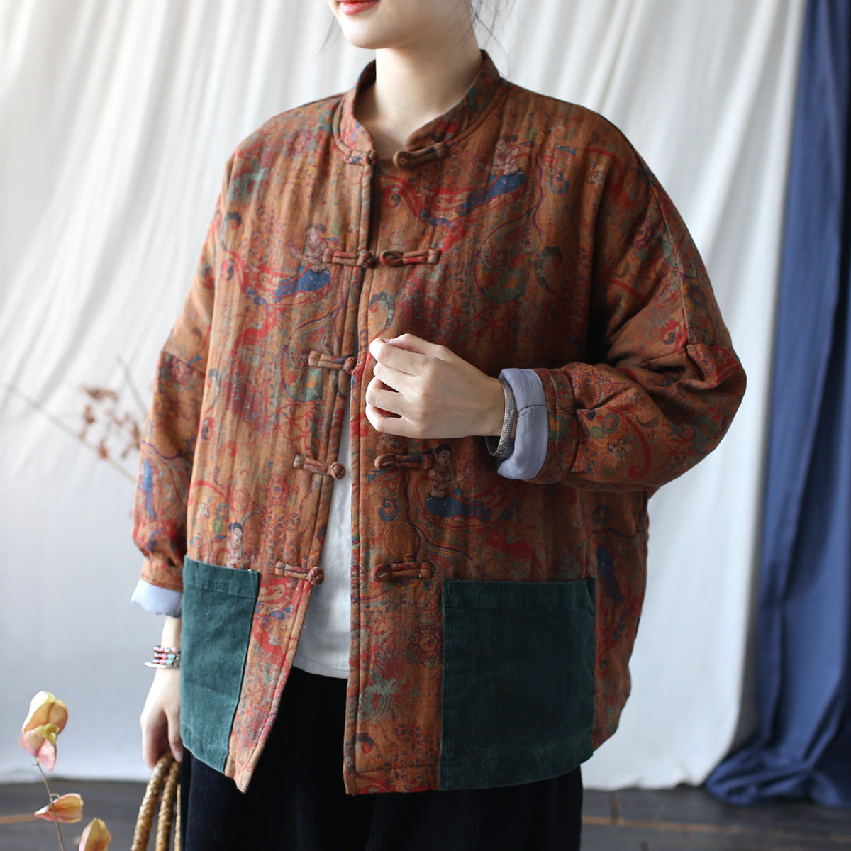 Vintage Printed Jacket, Chinese Standing Collar Cotton and Linen Jacket